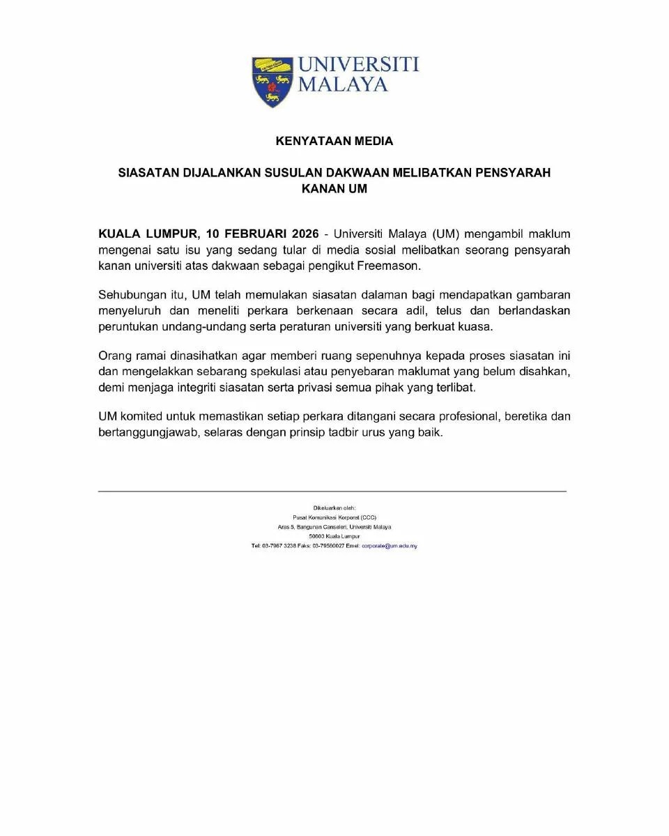 ஃப்ரீமேசன் ஆதரவாளராக மூத்த பேராசிரியர் மீது குற்றச்சாட்டு:விசாரணையைத் தொடங்கியுள்ளது மலாயா பல்கலைக்கழகம்