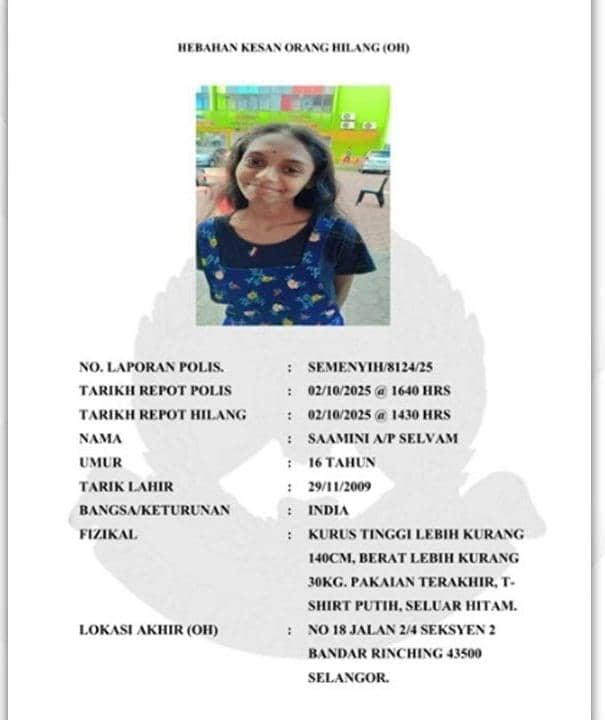 காணாமல் போன இளம் பெண் ஷாமினியை கண்டுபிடிக்க போலிஸ் பொதுமக்களின் உதவியை நாடுகிறது