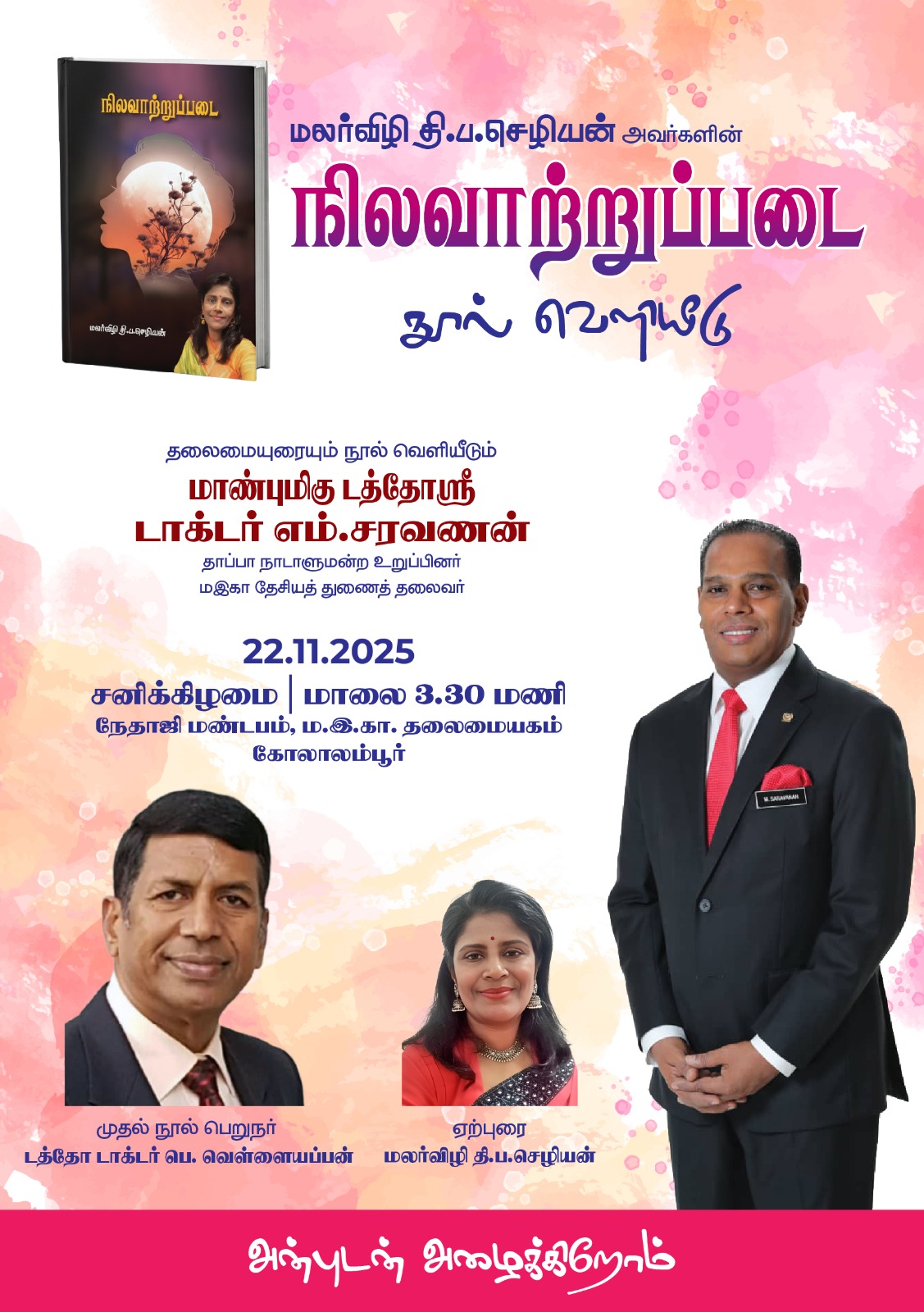 மலர்விழி தி.ப.செழியன் எழுதிய நிலவாற்றுப்படை நூல் டத்தோஸ்ரீ சரவணன் தலைமையில் வெளியீடு காண்கிறது