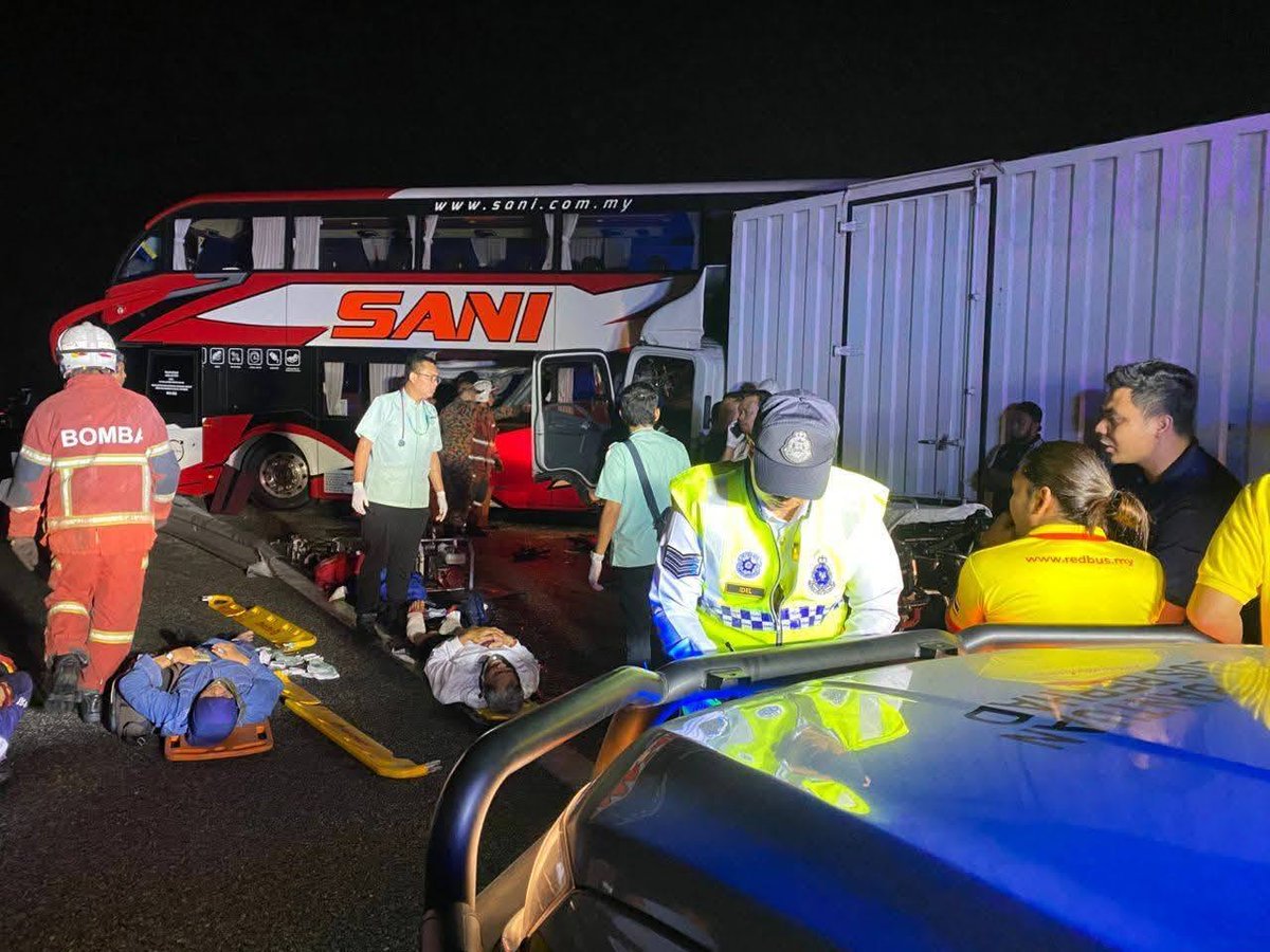 விரைவுப் பேருந்து, லோரி உட்படுத்திய விபத்தில் 4 பயணிகள், லோரி ஓட்டுநர் சிக்கிக் கொண்டனர்