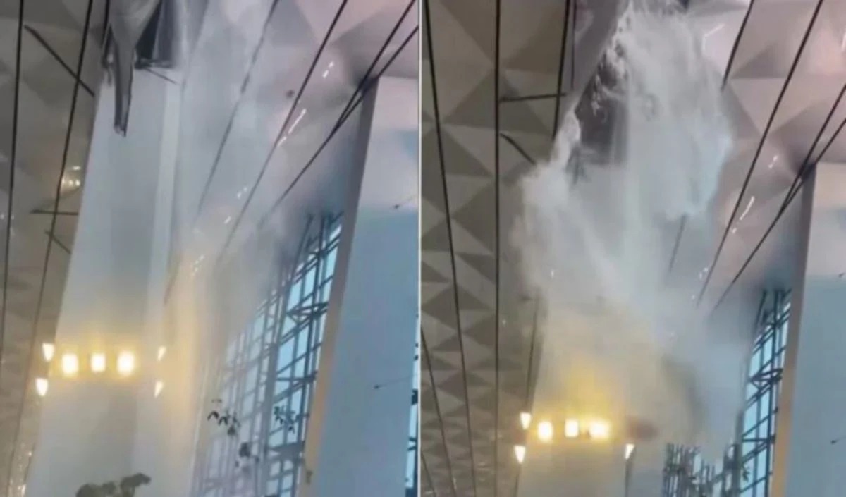 ஜகார்த்தா விமான நிலையத்தில் பரபரப்பு: மேற்கூரை இடிந்து விழுந்ததில் அருவி போலக் கொட்டிய மழைநீர்